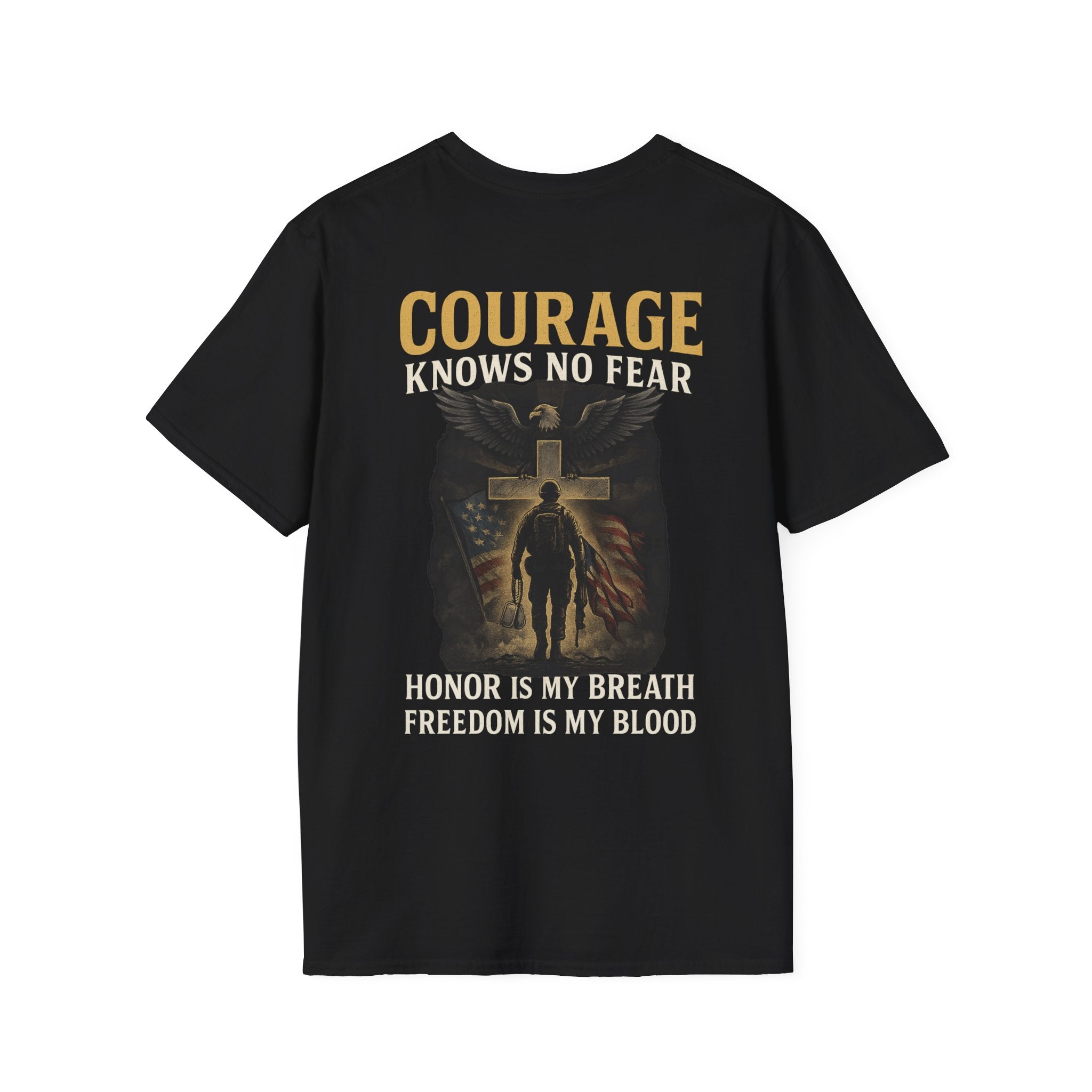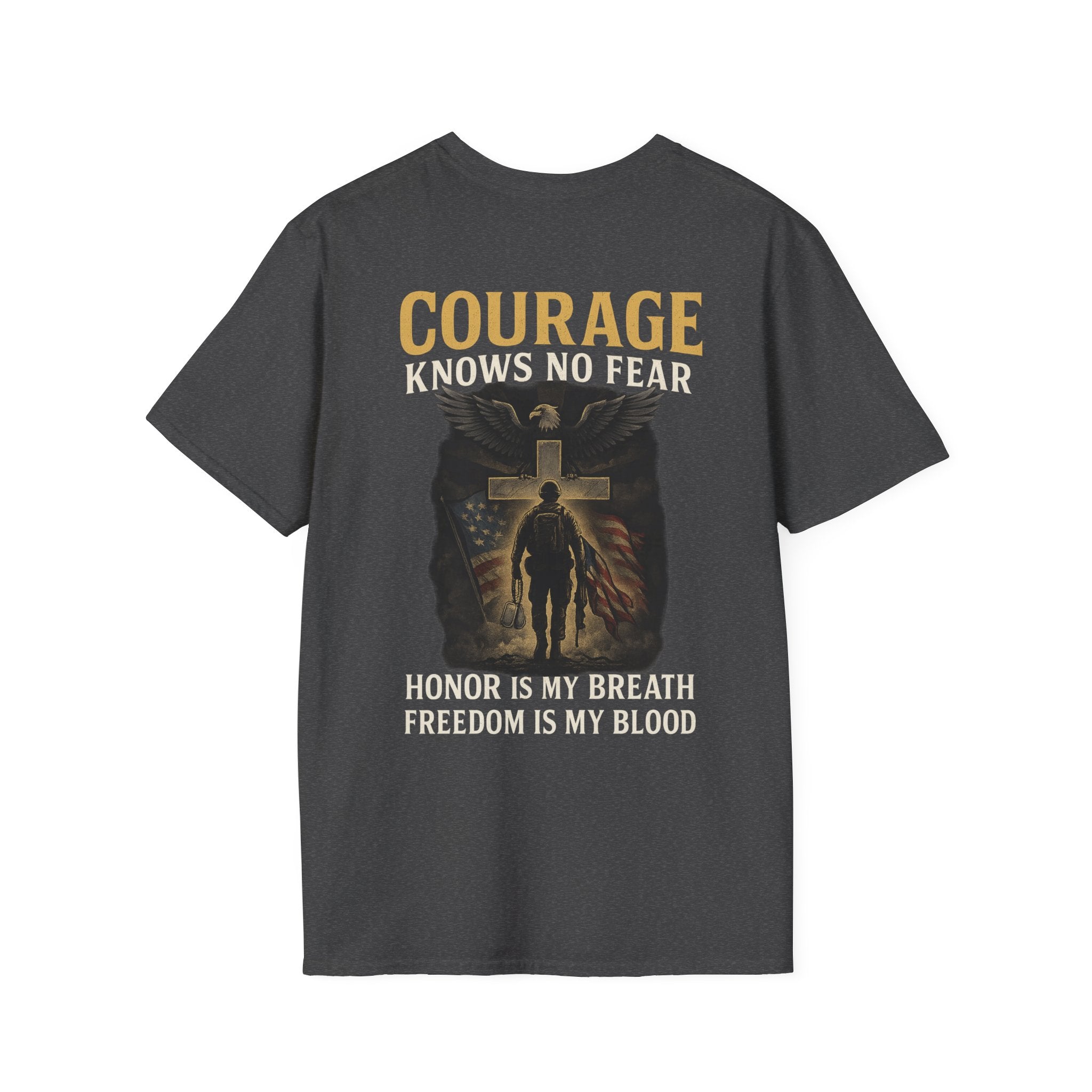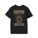 This soft, classic-fit tee carries a quiet kind of strength. The breathable ring‑spun cotton feels smooth against skin, while the roomy crew neck and clean silhouette let the design speak without fuss. On the back a bold, reverent graphic — a silhouetted figure before a cross and waving flag — pairs with strong, declarative text to create a shirt that reads like a personal statement of courage and duty. Wear it on cool evenings at the memorial, layered under a jacket for town events, or simply when you want clothing that reflects steady resolve.