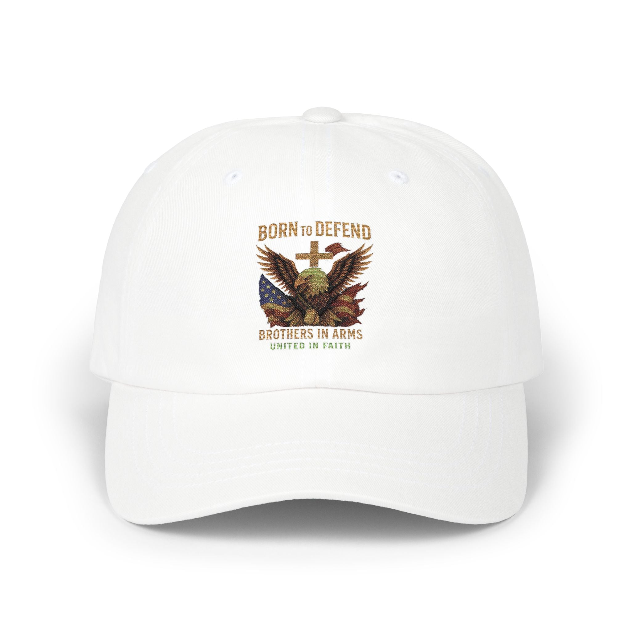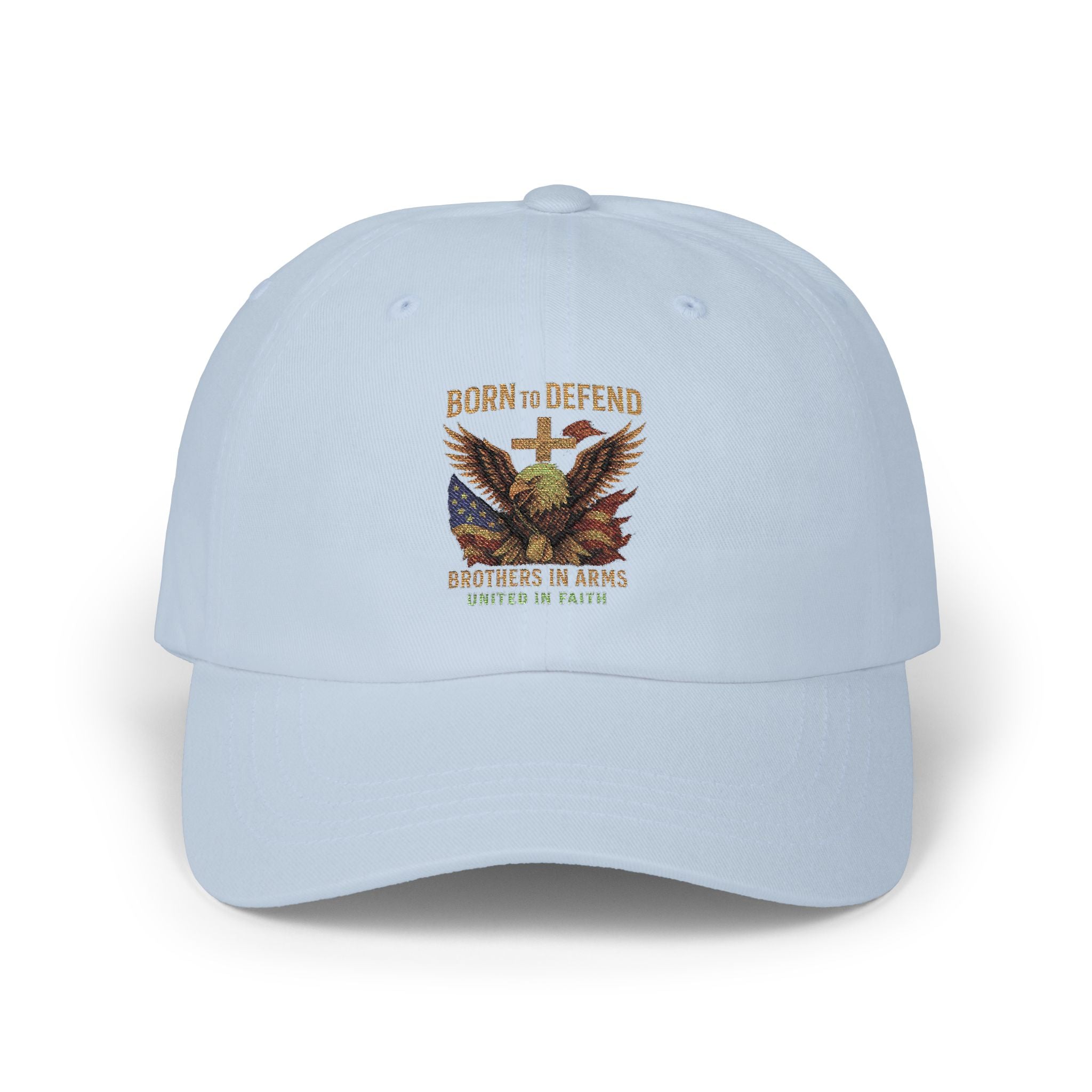 This classic dad cap brings a quiet, rugged confidence to everyday wear. Soft, low-profile cotton sits close to the head while a pre-curved Permacurv® visor shades the face with a neat, stitched finish. The embroidered eagle and ‘Born to Defend’ motif adds vintage patriotic character without shouting—an understated emblem for someone who values duty and heritage. The hideaway self-fabric strap with antique brass buckle lets you dial in a comfortable fit. Wear it on early morning runs, roadside barbecues, or while running errands — it settles in like an old friend and finishes a look with subtle, lived-in style.