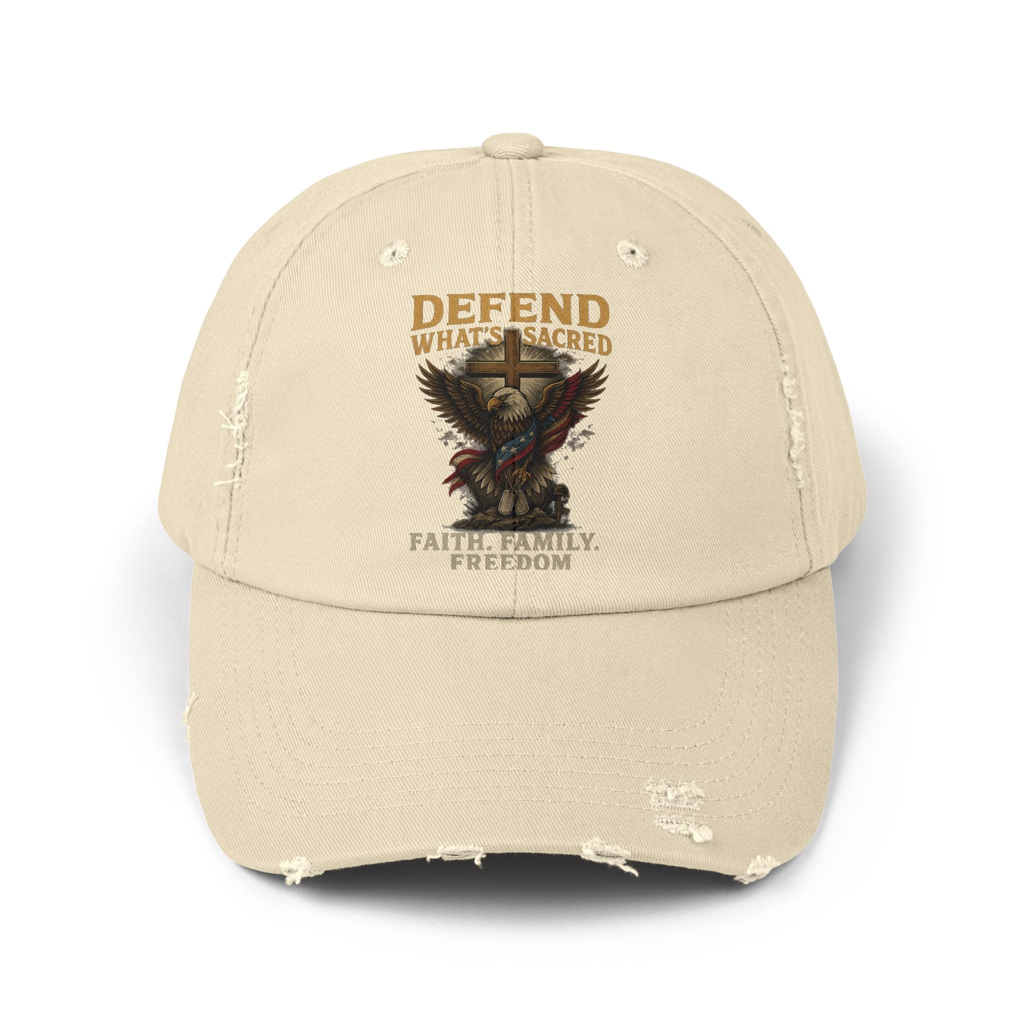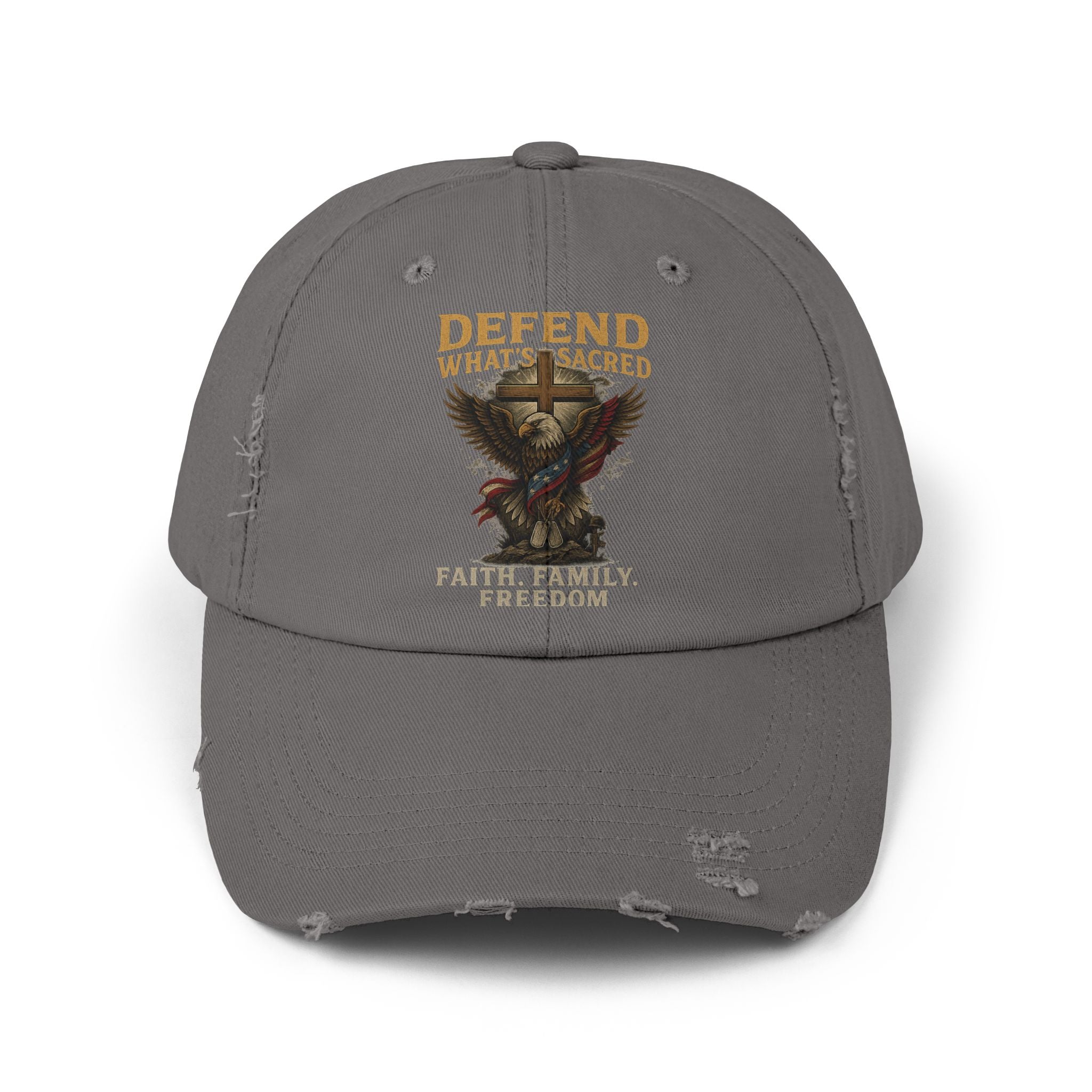 This distressed cotton cap carries a quiet, confident attitude. The faded black twill and worn edges make the embroidered design feel lived-in—an emblem you reach for when you want your beliefs to speak softly but clearly. An eagle motif lifts across the crown with the words “Defend What’s Sacred” and a small reminder of faith, family, freedom beneath. It settles low and easy on the head, the curved visor shading your eyes while the hidden fabric strap and metal D‑ring keep the fit personal. Wear it on early morning rides, backyard barbecues, or while running errands; it blends with denim jackets, work shirts, and the kind of boots that have seen a few good miles. Each hat’s distress and tone vary slightly, so yours will feel like it already has stories to tell.