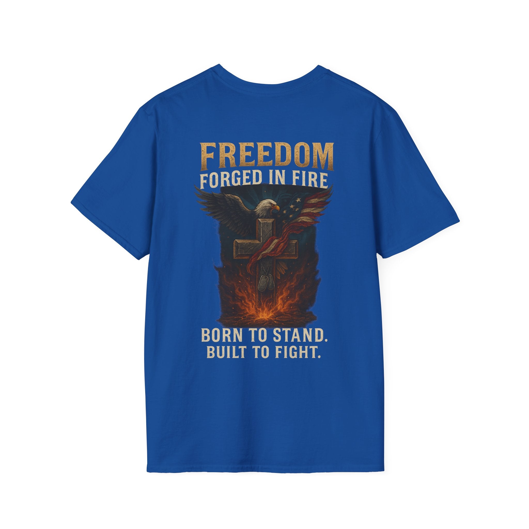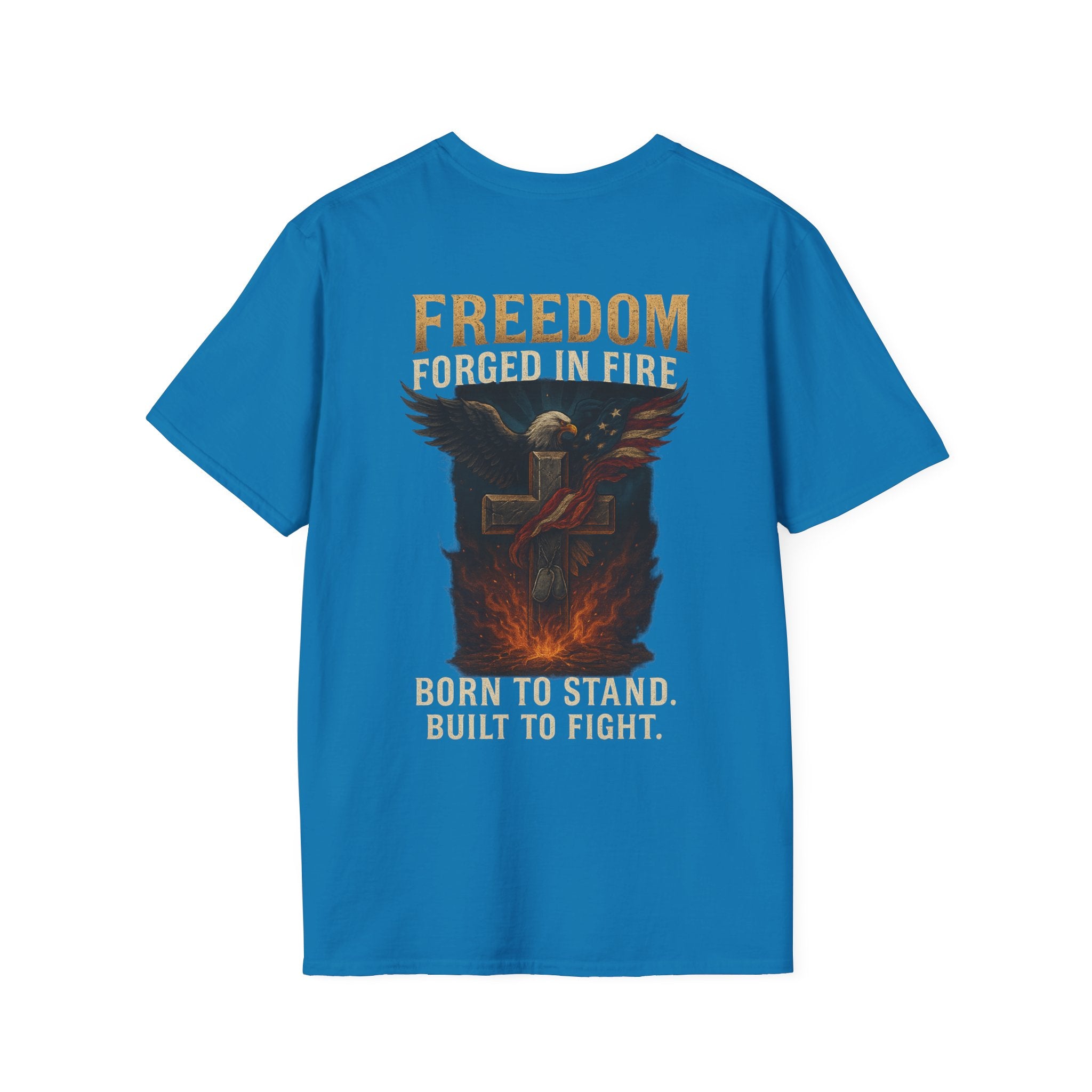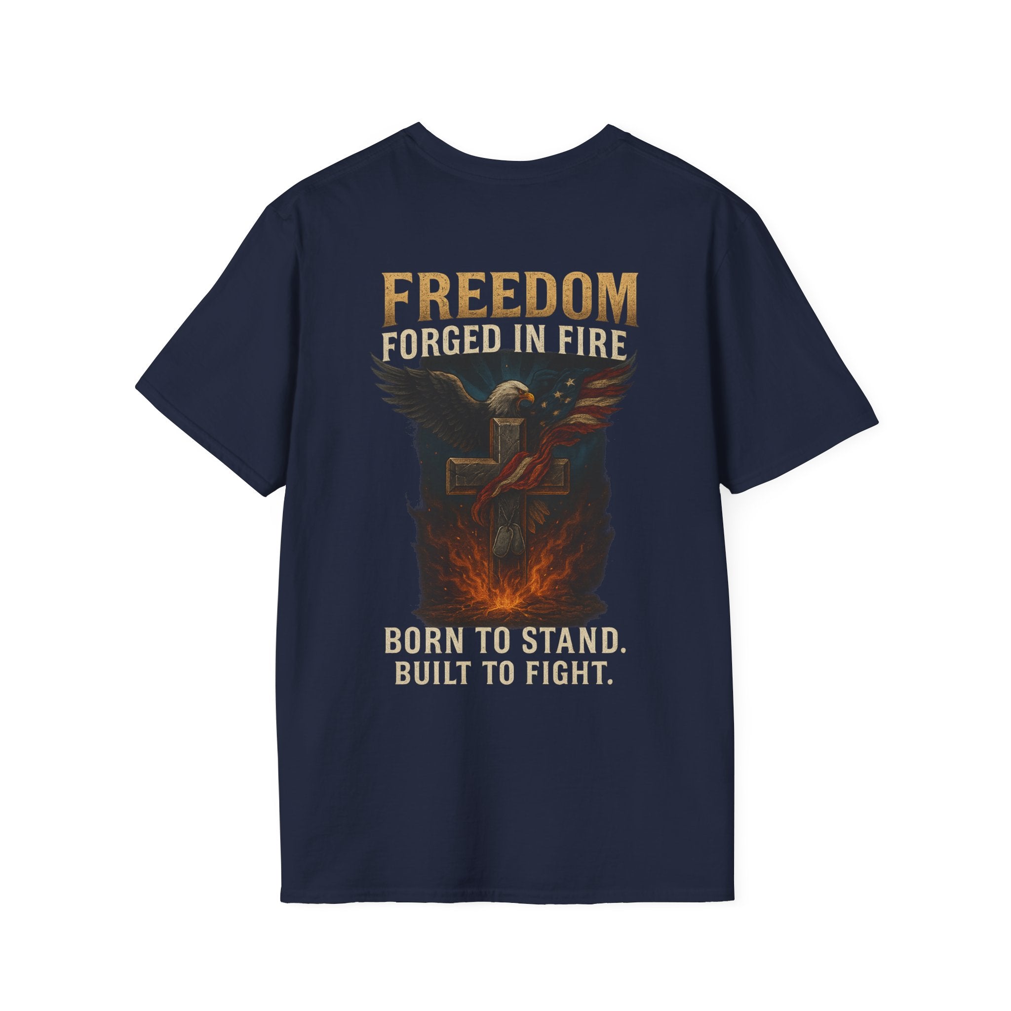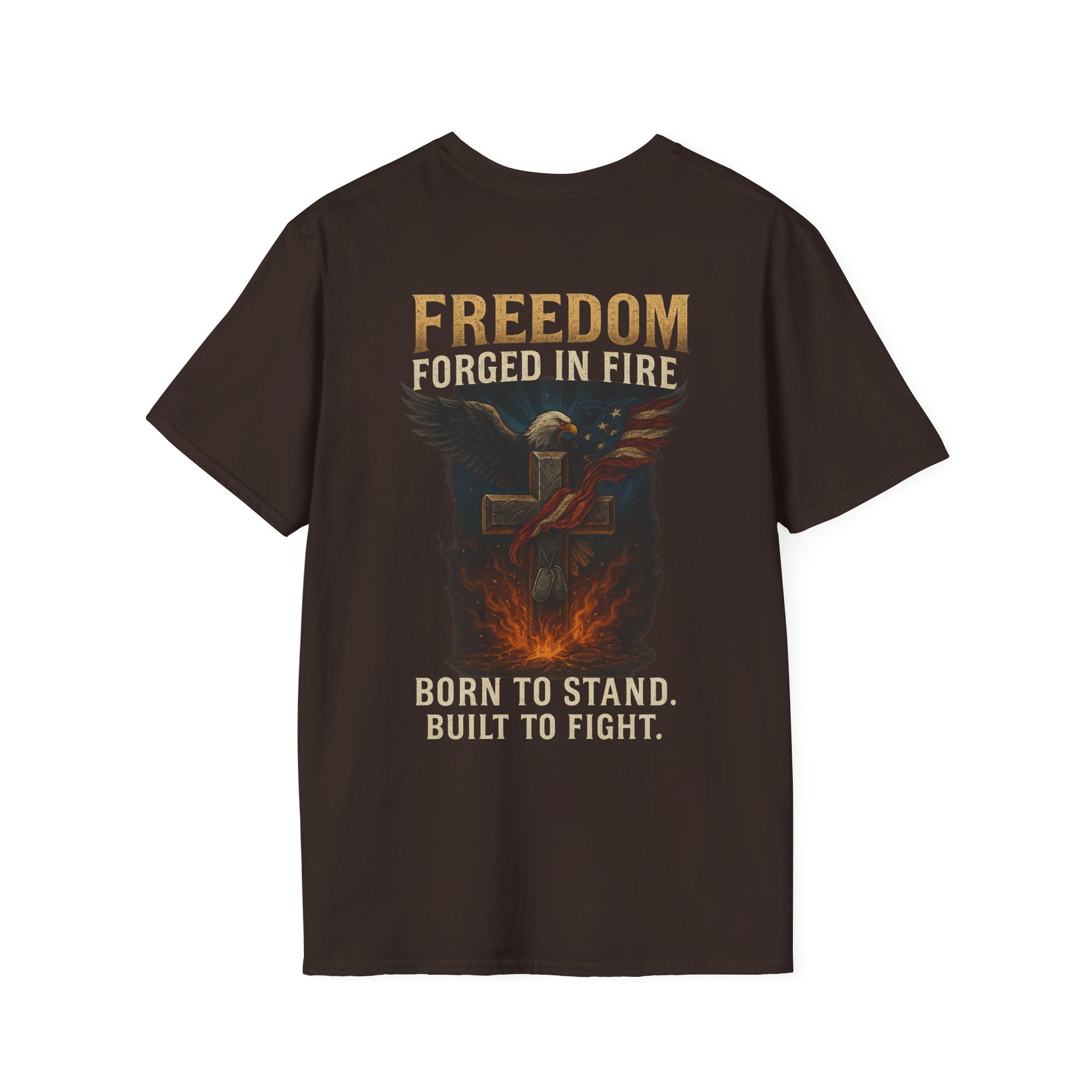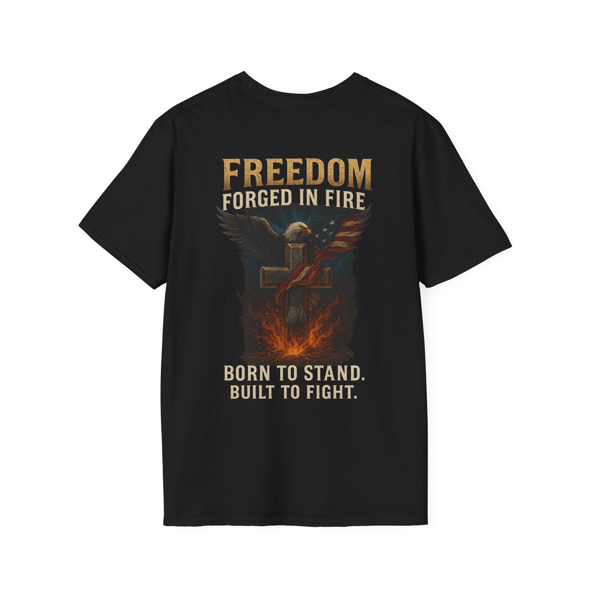 This lightweight crew-neck tee carries a strong, rugged message without sacrificing everyday comfort. The back print shows a bold, fire-lit emblem and the word FREEDOM, evoking resilience and grit. Made from ring-spun cotton with a soft, smooth hand, the shirt drapes cleanly and keeps its shape thanks to ribbed collar and shoulder tape. Wear it on training days, at rallies, or whenever you want a quiet statement of endurance — it feels lived-in but looks intentional.