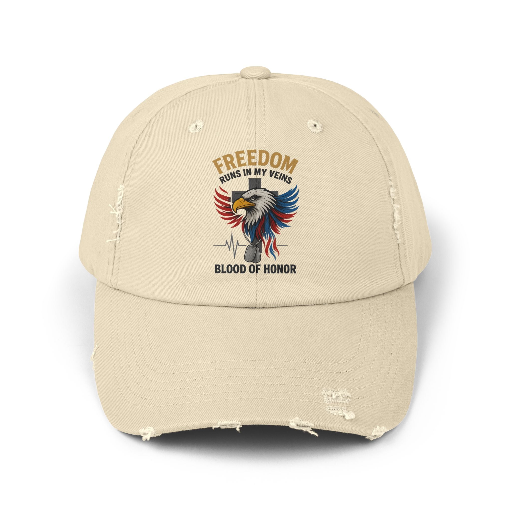 This distressed cotton cap carries a worn-in, Americana spirit. A bold eagle graphic in red, white and blue soars above a heartbeat line, under the words “FREEDOM” and “BLOOD OF HONOR,” giving the hat a rugged, lived-in look that reads like a story. The soft, unstructured 6-panel body and curved visor sit low and comfortable, while deliberate frays and color variation add character with each wear. The hideaway fabric strap with metal D-ring keeps the fit secure, and the DTF print preserves crisp detail across the faded finish. Wear it on long drives, backyard barbecues, or when you want a subtle nod to service and pride without shouting—this cap feels like an old favorite from the very first day.