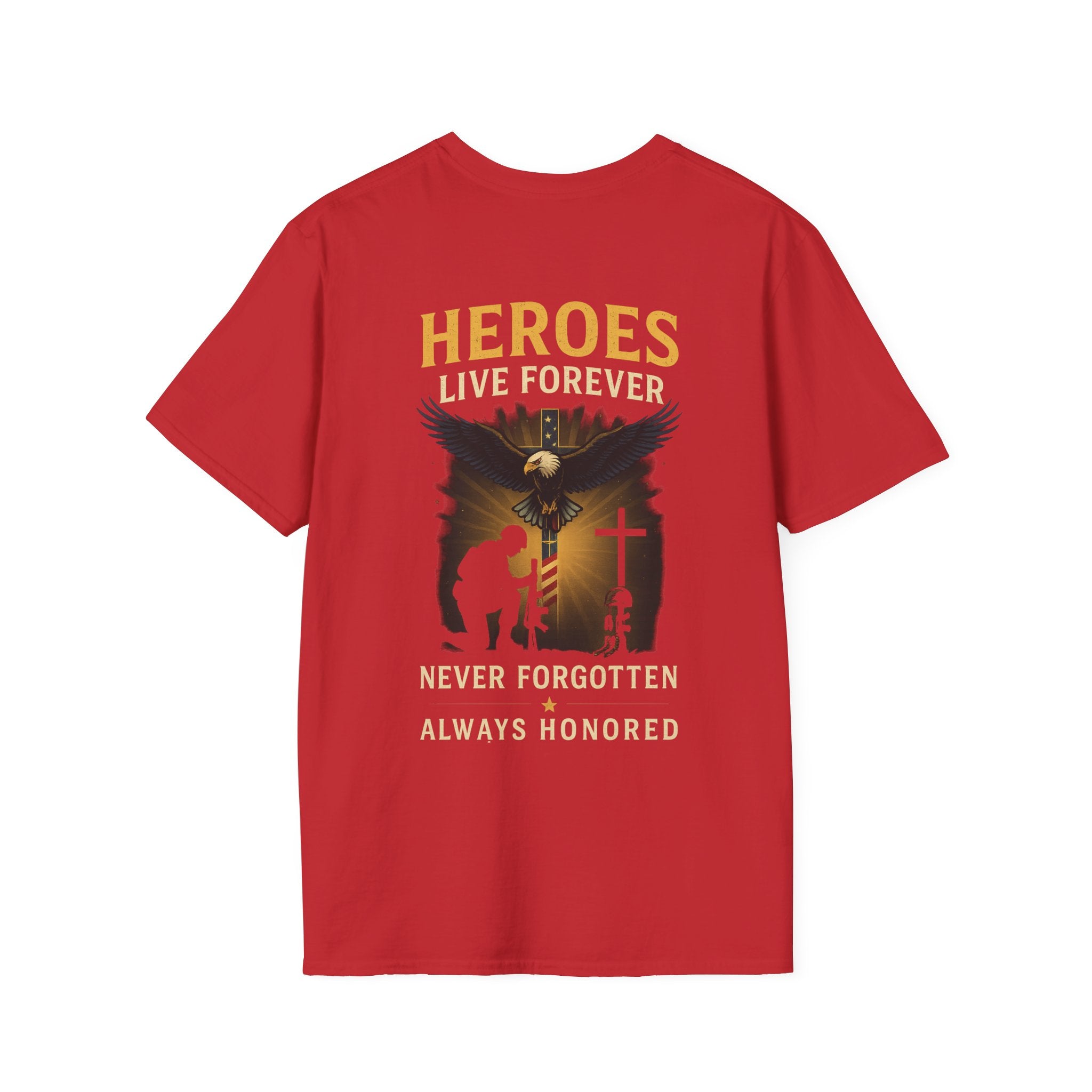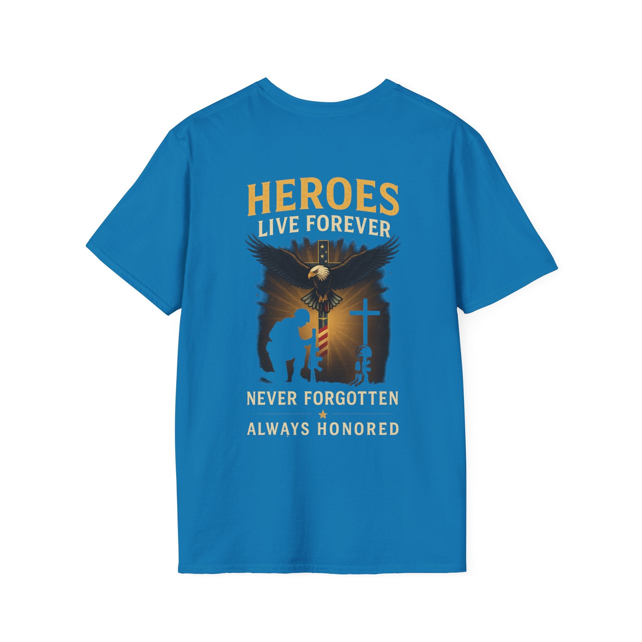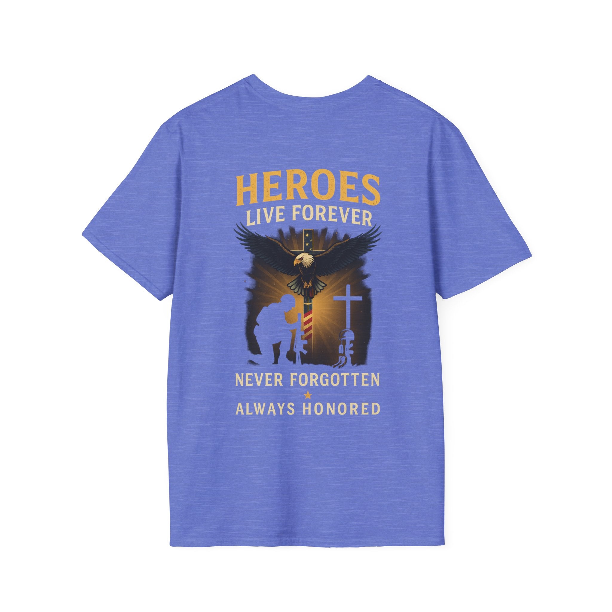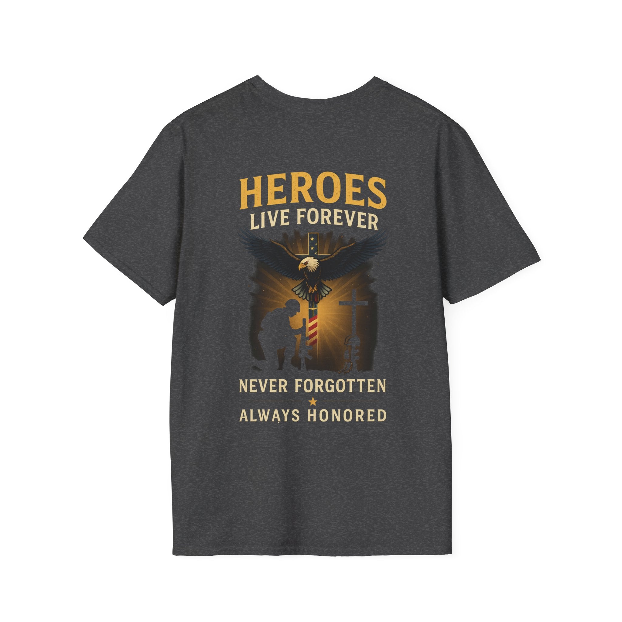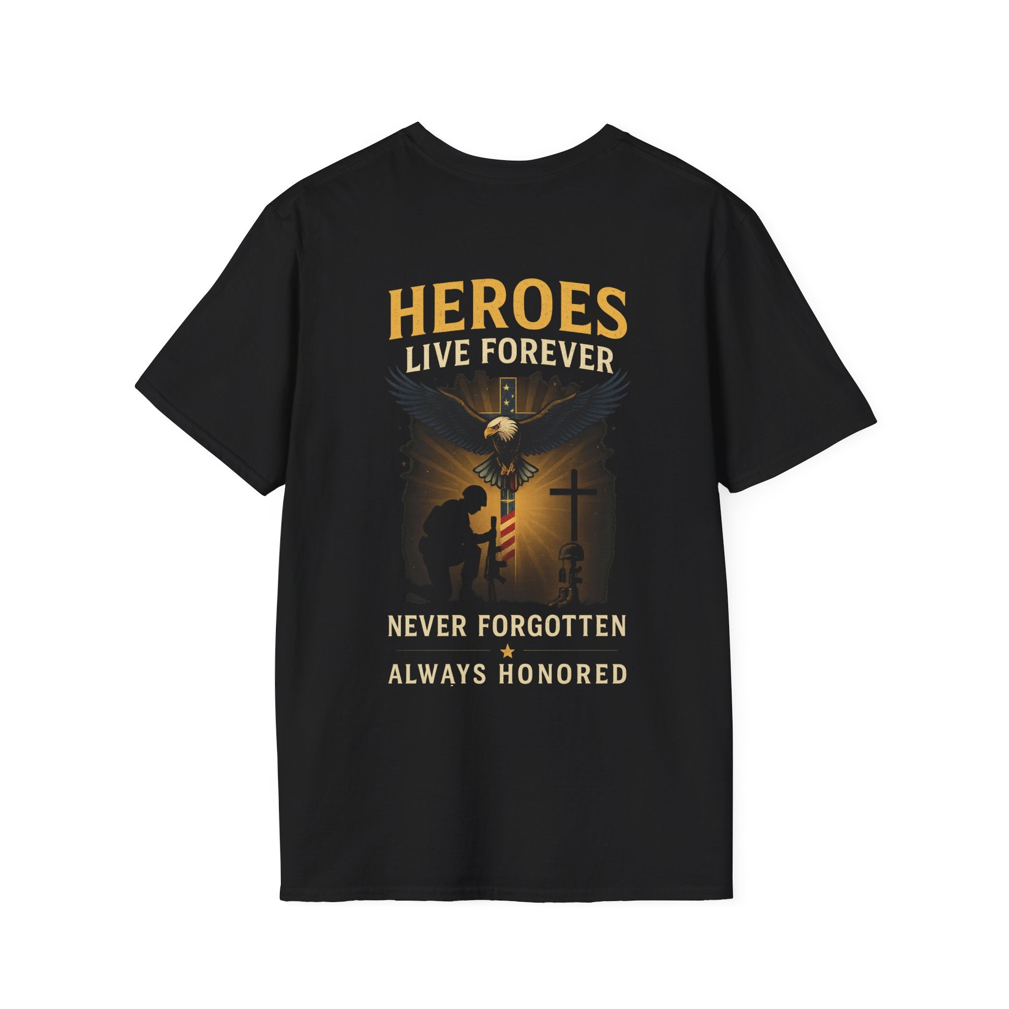 This soft, breathable tee carries a quiet, respectful energy — a lightweight canvas for a tribute that reads like a moment of stillness. The graphic folds rugged silhouette imagery with warm, muted tones: an eagle in flight, a bowed figure, and a cross framed by subtle light. Wear it to remember, to reflect, and to carry honor into everyday routines. The crew neckline and classic fit keep the look clean and easy; the fabric feels soft against skin and wears well through repeat wears. It settles into jeans, under a jacket, or layered for cooler mornings — a wearable nod of respect that fits into daily life without shouting.