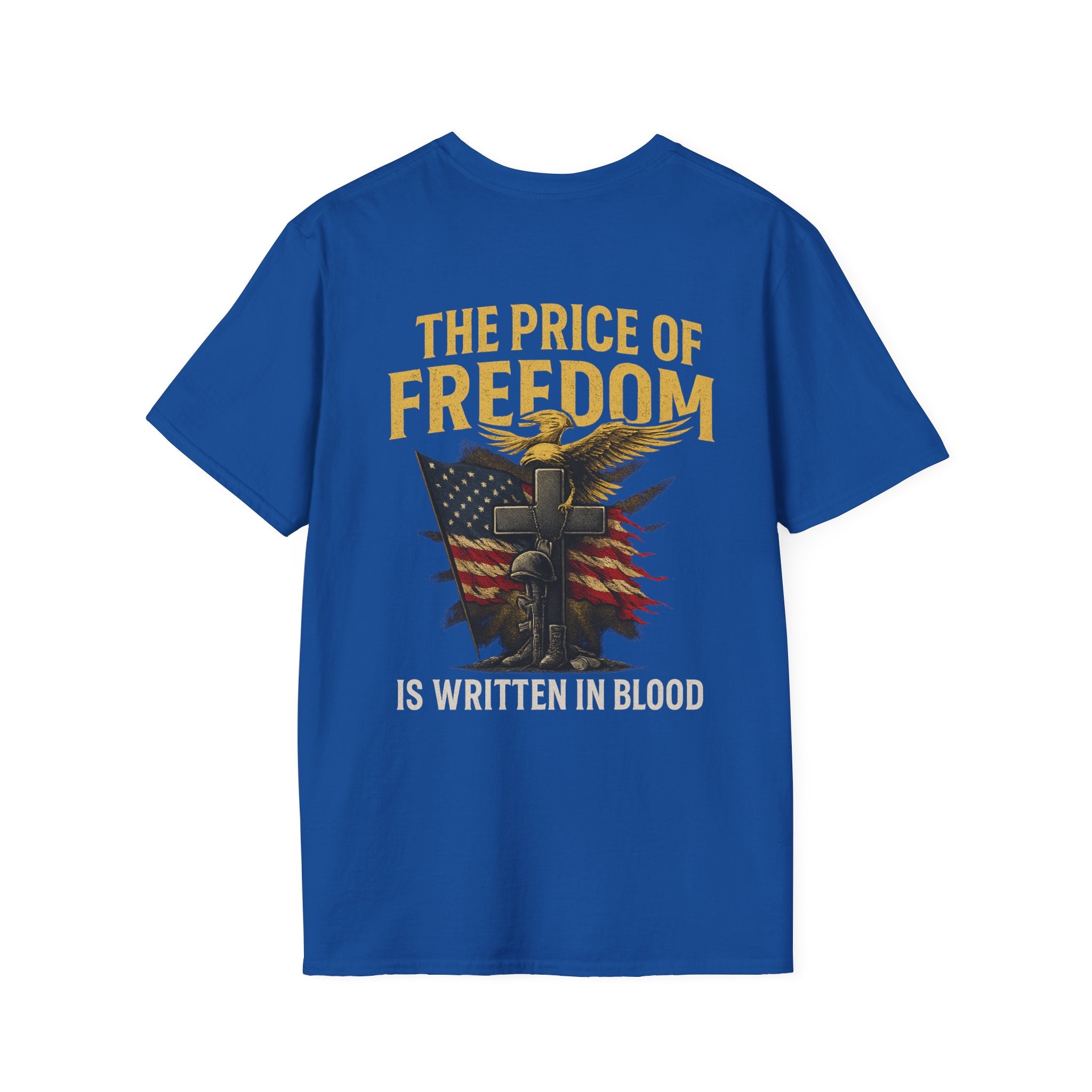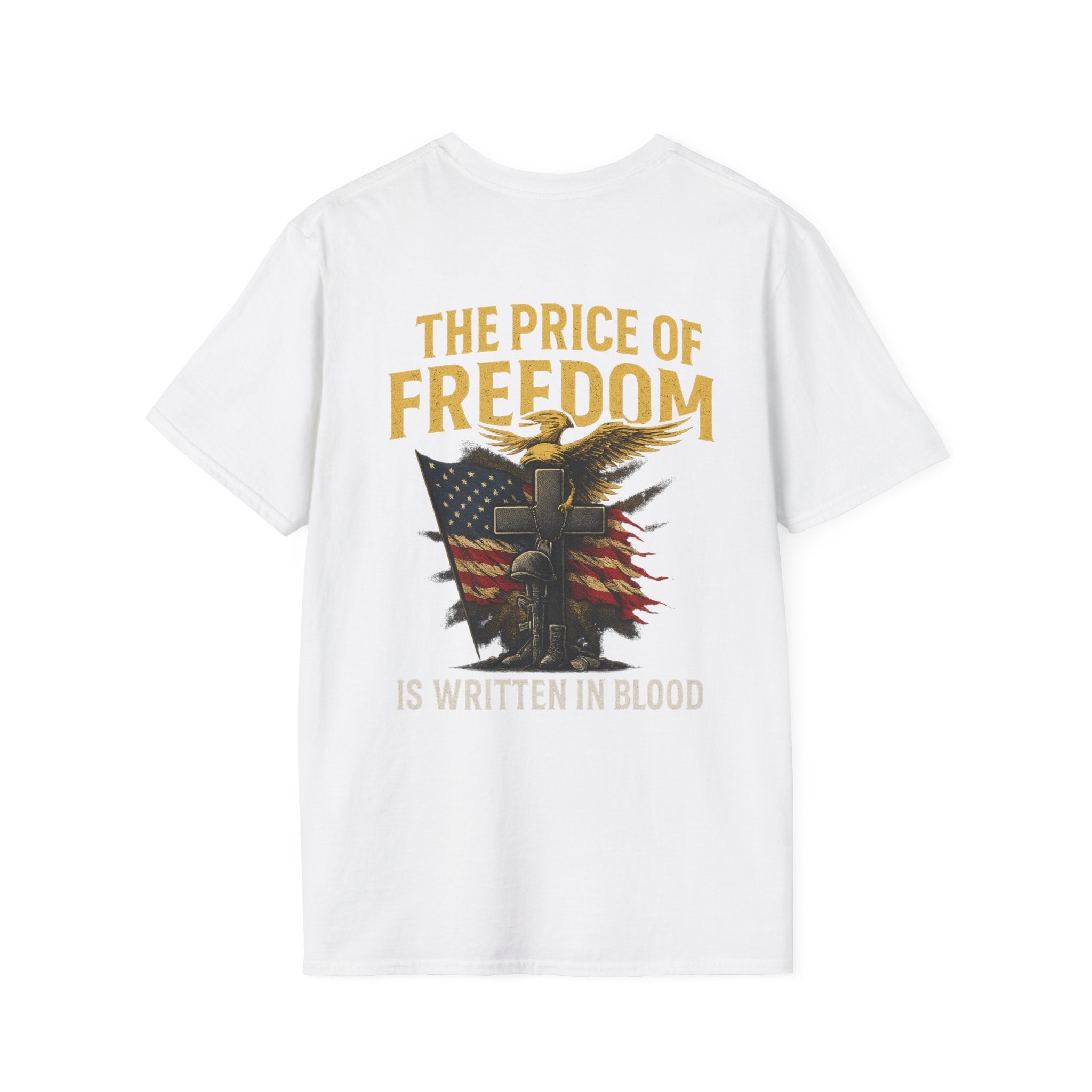 This lightweight cotton tee carries a quiet, resolute presence. A bold back graphic—an American flag, soaring eagle and a solemn cross—pairs with the words “THE PRICE OF FREEDOM” to create a shirt that reads like a moment of remembrance. The fabric feels soft against the skin and drapes cleanly from the classic crew neckline. Wear it on long drives, at memorial gatherings, or when you want an honest piece that honors sacrifice without shouting. It settles into everyday life easily: layered under a jacket, worn alone on warm days, or packed for road trips where meaning matters as much as comfort.